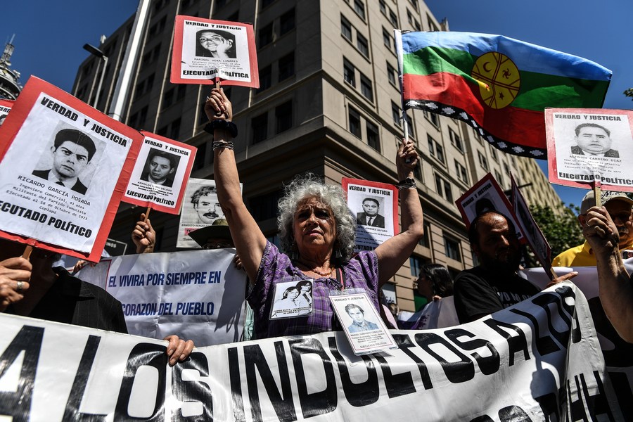 Personas participan durante una protesta convocada por la Agrupación de Familiares de Detenidos Desaparecidos (AFDD) y otras organizaciones político-sociales, en el marco del 70º aniversario de la Declaración Universal de los Derechos Humanos, frente al Palacio de la Moneda, en Santiago, capital de Chile, el 10 de diciembre de 2018. (Xinhua/Jorge Villegas)