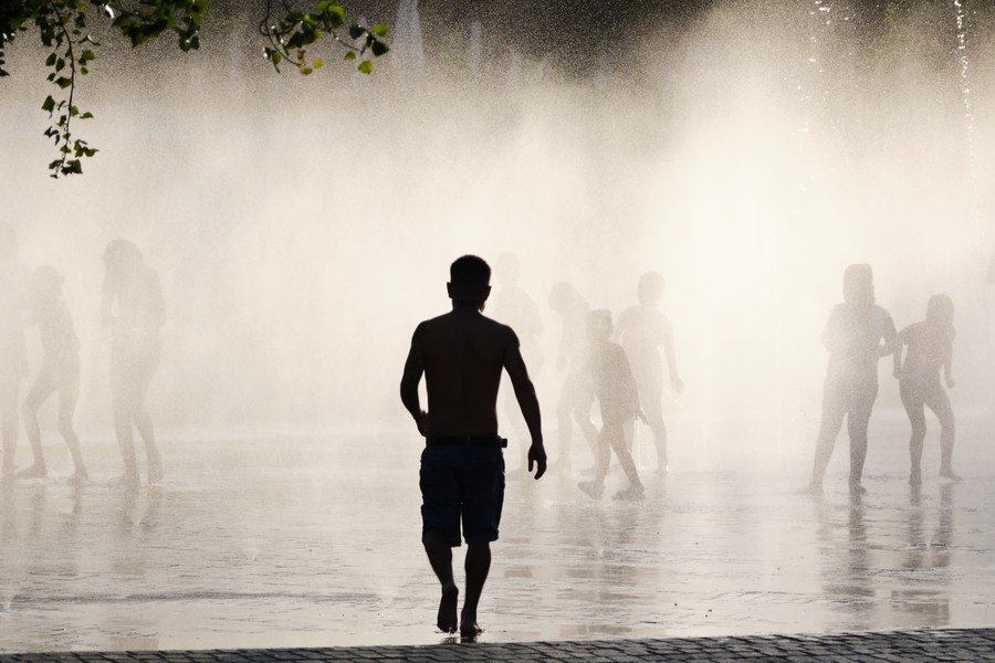 Imagen del 17 de julio de 2023 de un hombre caminando hacia una fuente para refrescarse, en Madrid, España. (Xinhua/Meng Dingbo)