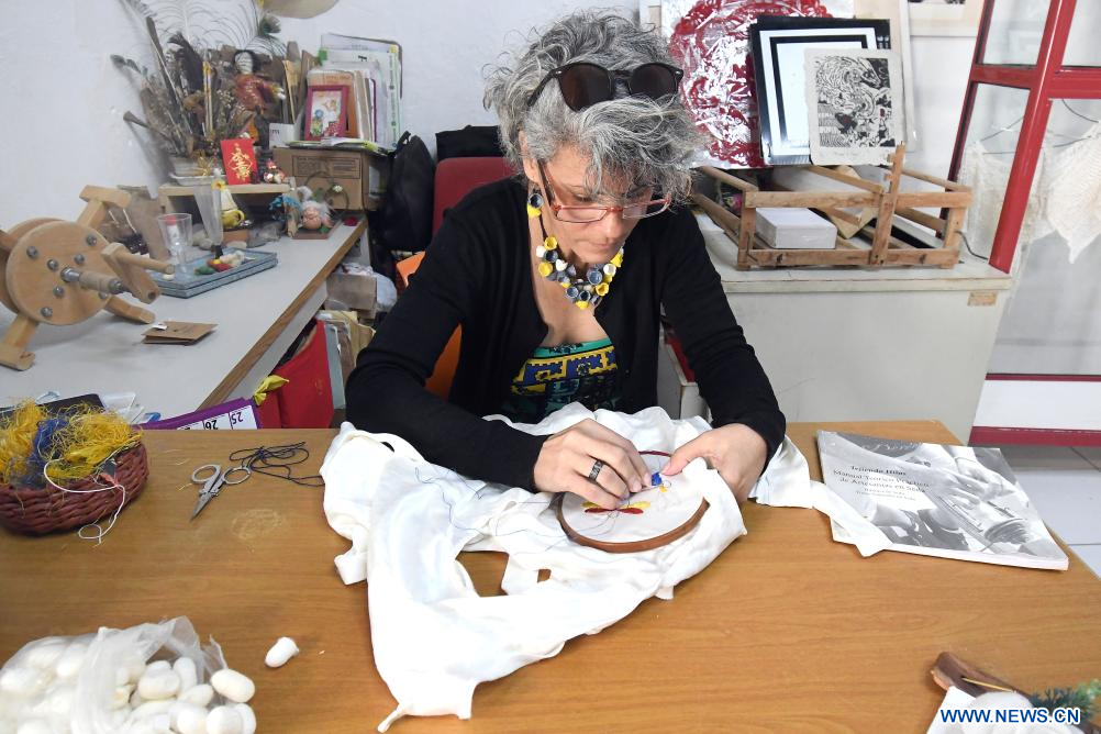 "Los artesanos nos hemos dado a la tarea de dar a conocer el proyecto de la seda en Cuba", dijo Chaviano a Xinhua, mientras desenrollaba una madeja de hilos de seda en su galería-taller.