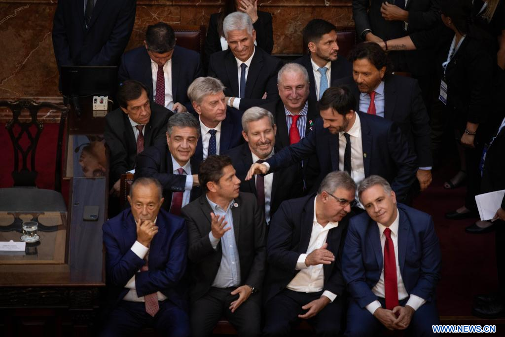 Imagen del 1 de marzo de 2024 de gobernadores de distintas provincias argentinas asistiendo a la asamblea de apertura del 142º período de sesiones ordinarias del Congreso, en la ciudad de Buenos Aires, capital de Argentina. Milei abrió el viernes el 142º período de sesiones ordinarias del Congreso, pidiendo la firma de un "nuevo pacto fundacional" en el país con 10 lineamientos básicos, entre ellos "la inviolabilidad de la propiedad privada" y un "equilibrio fiscal innegociable". (Xinhua/Martín Zabala)
