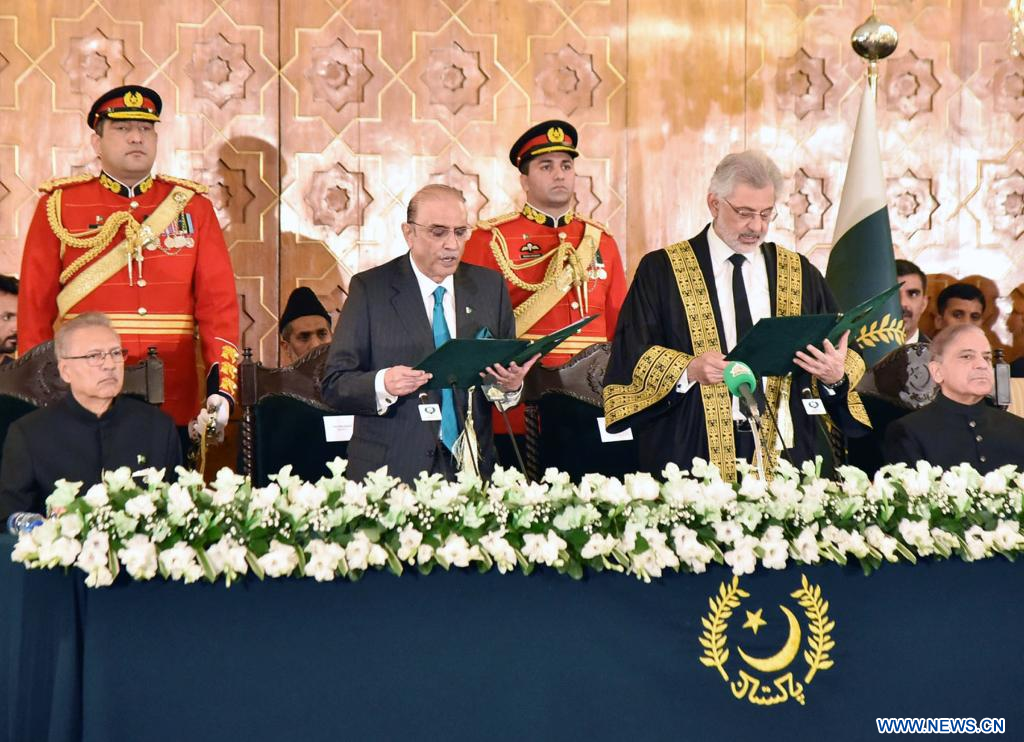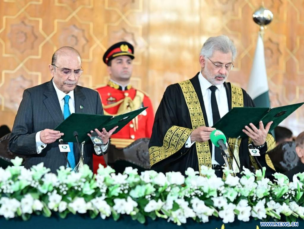 ISLAMABAD, 10 marzo, 2024 (Xinhua) -- El presidente del Tribunal Supremo de Pakistán, Qazi Faez Isa (d), presta juramento al recién elegido presidente Asif Ali Zardari, en la Casa Presidencial en Islamabad, capital de Pakistán, el 10 de marzo de 2024. Asif Ali Zardari prestó juramento el domingo como 14° presidente de Pakistán durante una ceremonia celebrada en la Casa Presidencial, indica un comunicado de la Oficina del Presidente. (Xinhua/Departamento de Información de Prensa de Pakistán)