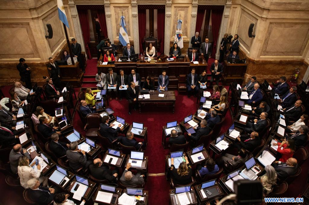BUENOS AIRES, 17 marzo, 2024 (Xinhua) -- Imagen del 14 de marzo de 2024 del recinto de la Cámara de Senadores durante la sesión en la que se debatió la aprobación o rechazo de un decreto de necesidad y urgencia (DNU) del presidente argentino, Javier Milei, en el Congreso Nacional, en la ciudad de Buenos Aires, Argentina. Ajuste del gasto público, medidas de "choque" y confrontación política con gobernadores o partidos de oposición han marcado los primeros 100 días del Gobierno del liberal Javier Milei en Argentina, según la opinión de analistas del país sudamericano consultados por Xinhua. (Xinhua/Martín Zabala)