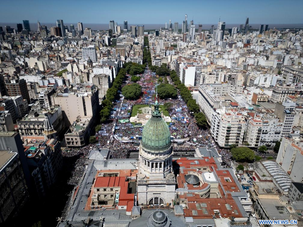 BUENOS AIRES, 17 marzo, 2024 (Xinhua) -- Vista aérea tomada con un dron el 24 de enero de 2024 de la Plaza de los Dos Congresos durante una manifestación en el marco del paro general de actividades dispuesto por sindicatos y organizaciones sociales, en la ciudad de Buenos Aires, Argentina. Ajuste del gasto público, medidas de "choque" y confrontación política con gobernadores o partidos de oposición han marcado los primeros 100 días del Gobierno del liberal Javier Milei en Argentina, según la opinión de analistas del país sudamericano consultados por Xinhua. (Xinhua/Ezequiel Putruele)
