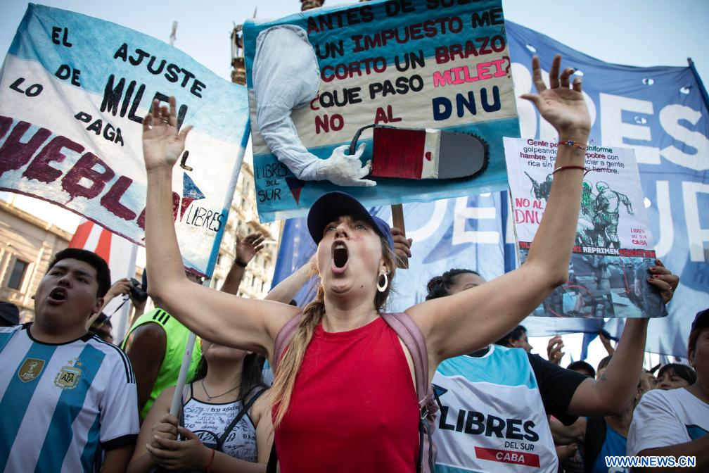 BUENOS AIRES, 17 marzo, 2024 (Xinhua) -- Imagen del 2 de febrero de 2024 de una mujer participando en una manifestación frente al Congreso Nacional durante la sesión especial convocada por el oficialismo para tratar la iniciativa "Bases y Puntos de Partida para la Libertad de los Argentinos" en la Cámara de Diputados del Congreso Nacional, en la ciudad de Buenos Aires, Argentina. Ajuste del gasto público, medidas de "choque" y confrontación política con gobernadores o partidos de oposición han marcado los primeros 100 días del Gobierno del liberal Javier Milei en Argentina, según la opinión de analistas del país sudamericano consultados por Xinhua. (Xinhua/Martín Zabala)