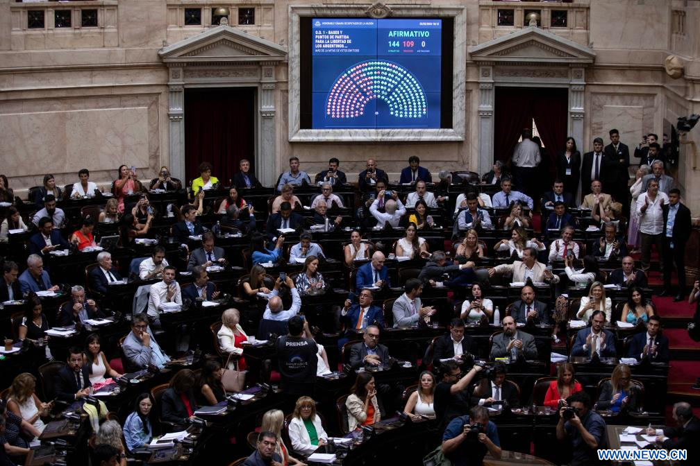BUENOS AIRES, 17 marzo, 2024 (Xinhua) -- Imagen del 2 de febrero de 2024 de legisladores oficialistas reaccionando después de la votación favorable a la iniciativa elaborada por el gobierno del presidente argentino, Javier Milei, al finalizar la sesión especial convocada por el oficialismo para tratar la iniciativa "Bases y Puntos de Partida para la Libertad de los Argentinos" en la Cámara de Diputados del Congreso Nacional, en la ciudad de Buenos Aires, Argentina. Ajuste del gasto público, medidas de "choque" y confrontación política con gobernadores o partidos de oposición han marcado los primeros 100 días del Gobierno del liberal Javier Milei en Argentina, según la opinión de analistas del país sudamericano consultados por Xinhua. (Xinhua/Martín Zabala)