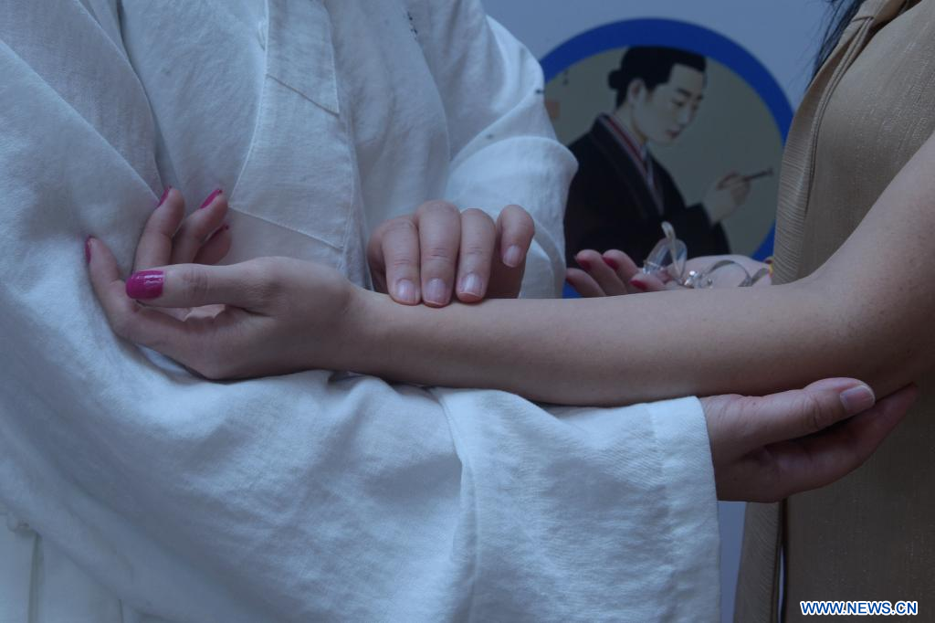 Fei Wang, médica especializada en medicina tradicional china, examina el pulso a una persona durante el II Congreso Internacional de Medicina Tradicional China (MTC), en Brasilia, Brasil, el 23 de marzo de 2024. Con la participación de destacadas personalidades, inició el jueves en el Centro Internacional de Convenciones de Brasilia el II Congreso Internacional de MTC, que se llevará a cabo del 21 al 23 de marzo con el lema: "Integrando Prevención, Promoción y Sostenibilidad en los Sistemas de Salud". (Xinhua/Lucio Tavora)