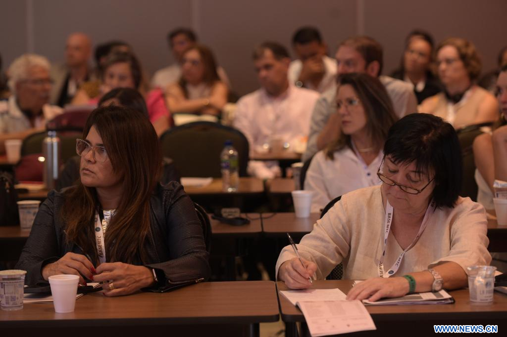 Estudiantes asisten a una conferencia durante el II Congreso Internacional de Medicina Tradicional China (MTC), en Brasilia, Brasil, el 22 de marzo de 2024. Con la participación de destacadas personalidades, inició el jueves en el Centro Internacional de Convenciones de Brasilia el II Congreso Internacional de MTC, que se llevará a cabo del 21 al 23 de marzo con el lema: "Integrando Prevención, Promoción y Sostenibilidad en los Sistemas de Salud". (Xinhua/Lucio Tavora)