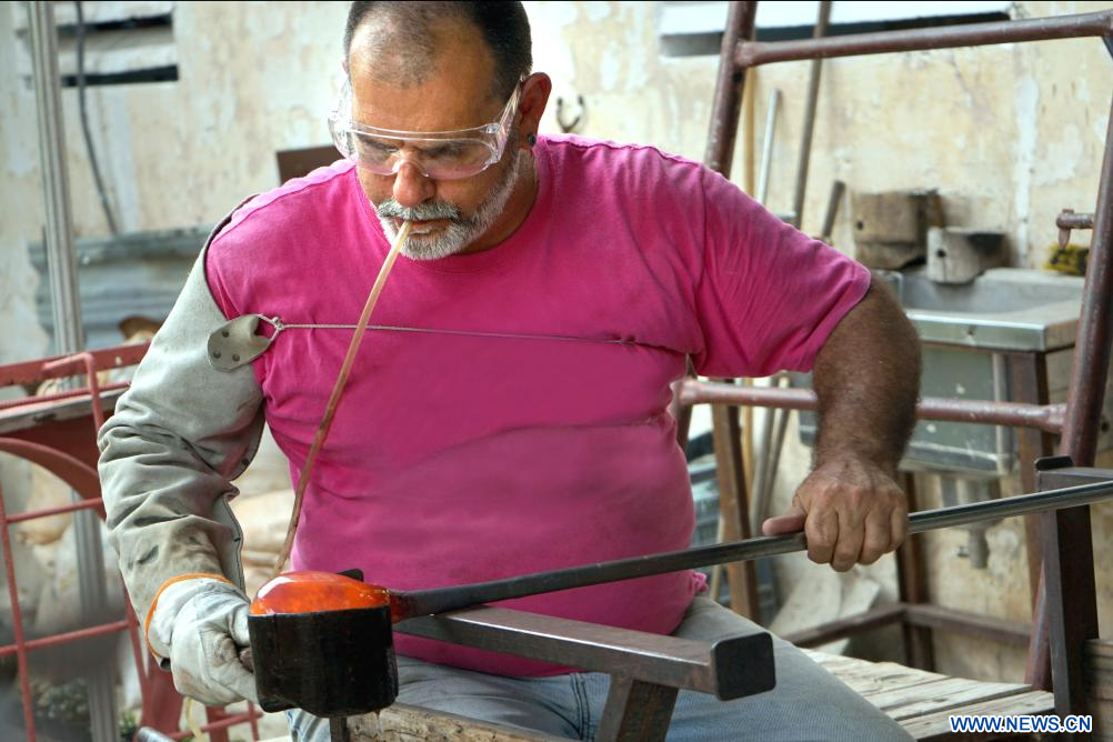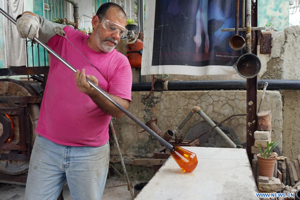 LA HABANA, 12 abr (Xinhua) -- El patio de una vivienda familiar en La Habana sirve como taller desde hace más de una década al artista cubano Eduardo Viciana, uno de los pocos artesanos en la isla caribeña que domina el milenario arte del vidrio soplado.