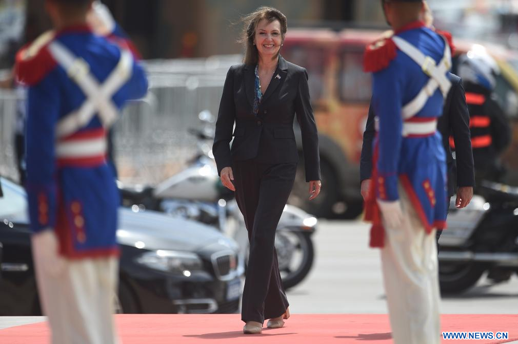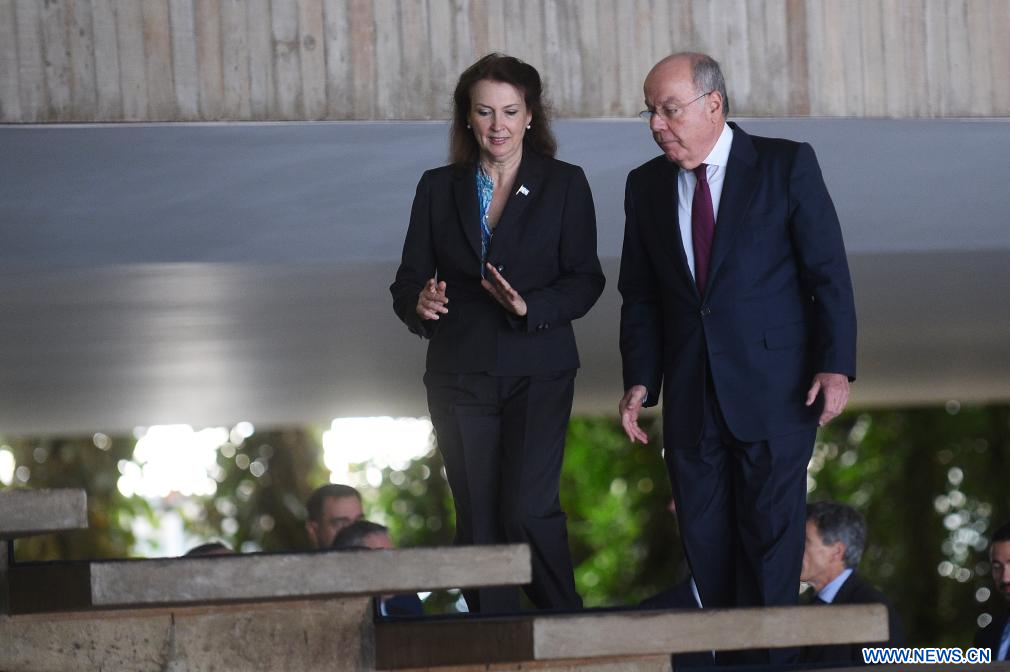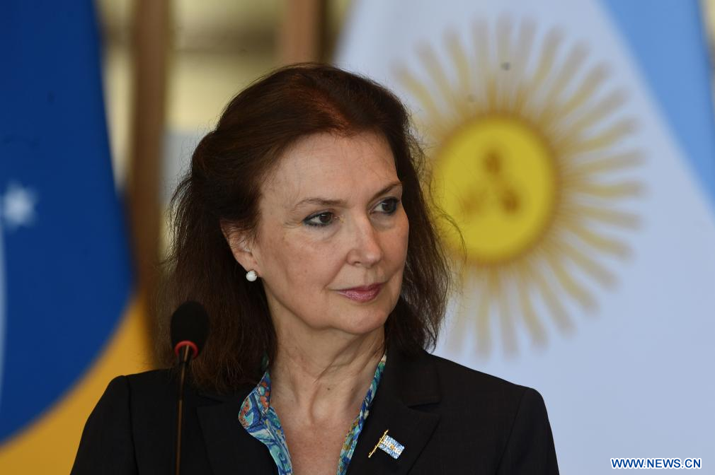 La ministra de Relaciones Exteriores de Argentina, Diana Mondino, llega a una reunión de trabajo con el ministro de Relaciones Exteriores de Brasil, Mauro Vieira, en el marco de una visita oficial a Brasil, en el Palacio de Itamaraty, en Brasilia, Brasil, el 15 de abril de 2024. Vieira y Mondino reafirmaron el lunes en una reunión en el Palacio de Itamaraty, la cancillería brasileña en Brasilia, la relación estratégica entre los dos países, la cooperación bilateral y la continuidad de los proyectos en común. (Xinhua/Lucio Tavora)