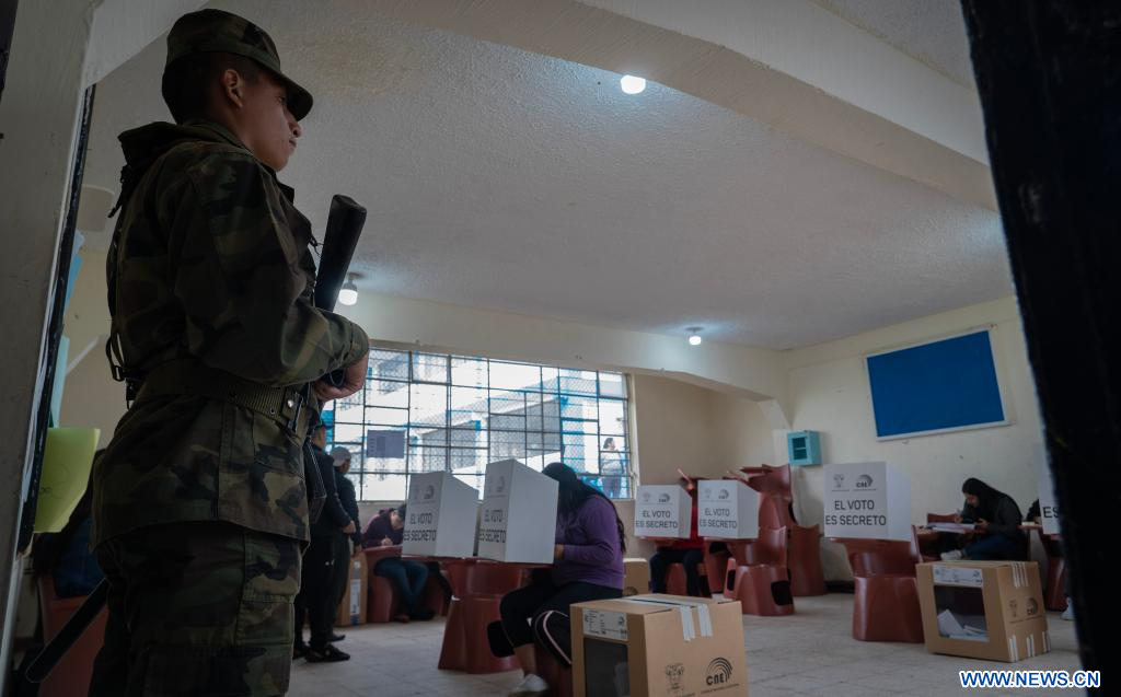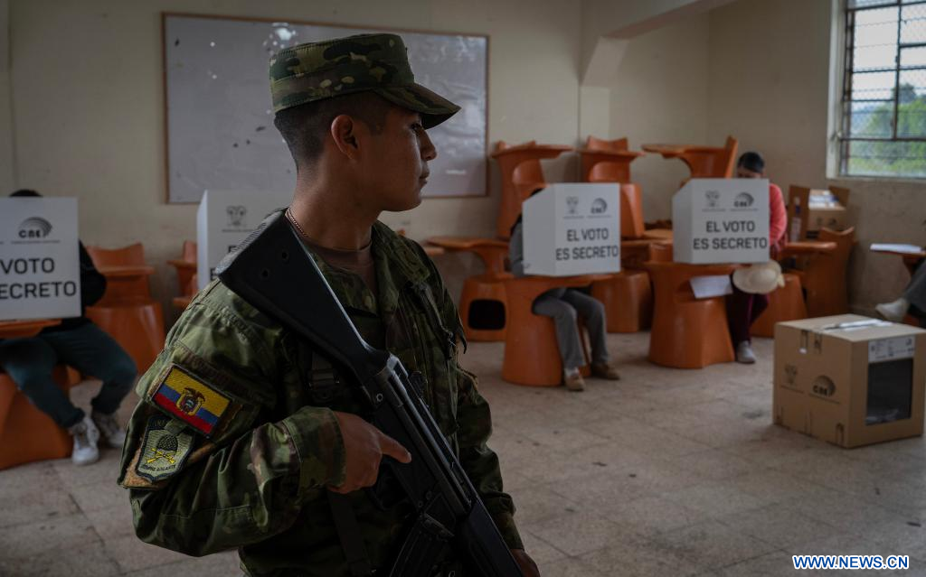 Un militar vigila en un colegio electoral, en Quito, capital de Ecuador, el 21 de abril de 2024. Los colegios electorales en Ecuador abrieron el domingo a las 07:00 hora local (12:00 GMT) para las votaciones de la consulta popular y referendo constitucional propuesto por el Gobierno sobre temas de seguridad, justicia, empleo y arbitrajes internacionales. (Xinhua/Str)