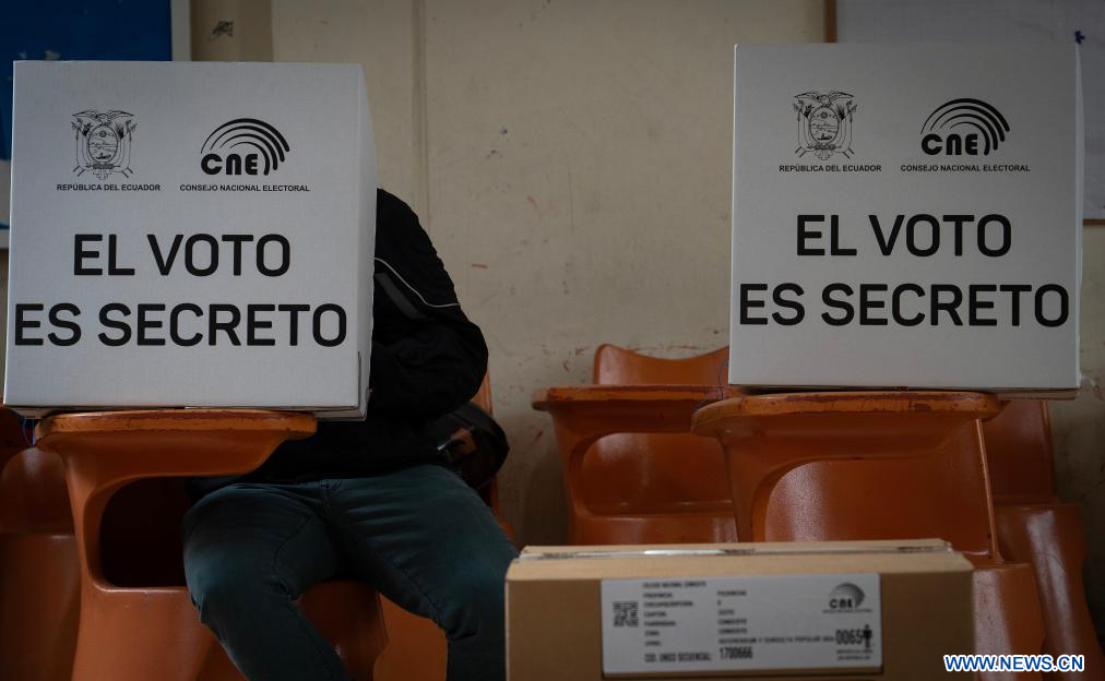 Un hombre emite su voto en un colegio electoral, en Quito, capital de Ecuador, el 21 de abril de 2024. Los colegios electorales en Ecuador abrieron el domingo a las 07:00 hora local (12:00 GMT) para las votaciones de la consulta popular y referendo constitucional propuesto por el Gobierno sobre temas de seguridad, justicia, empleo y arbitrajes internacionales. (Xinhua/Str)