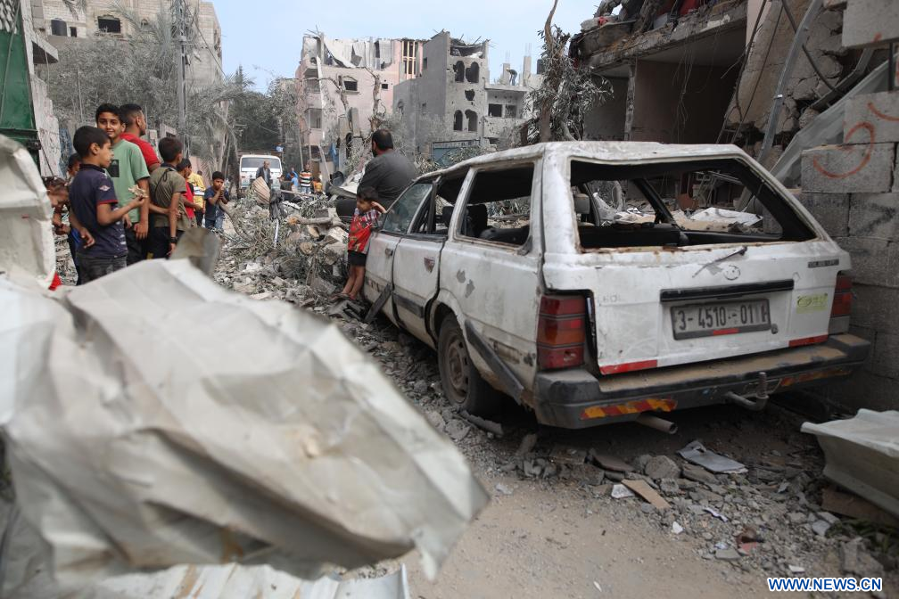 Personas se reúnen junto a un vehículo destruido, en la ciudad de Deir el-Balah, en el centro de la Franja de Gaza, el 1 de mayo de 2024. La cifra de palestinos muertos debido a los actuales ataques israelíes contra la Franja de Gaza aumentó a 34.568, informó el miércoles en un comunicado el Ministerio de Salud dirigido por Hamás. (Xinhua)