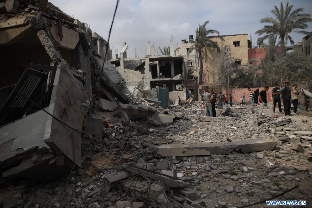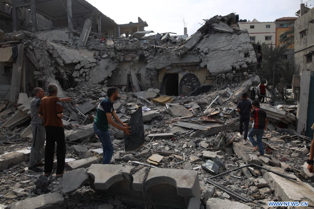 Personas se encuentran entre los escombros de una casa destruida, en la ciudad de Deir el-Balah, en el centro de la Franja de Gaza, el 1 de mayo de 2024. La cifra de palestinos muertos debido a los actuales ataques israelíes contra la Franja de Gaza aumentó a 34.568, informó el miércoles en un comunicado el Ministerio de Salud dirigido por Hamás. (Xinhua)