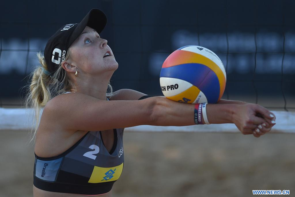 Taryn Kloth, de Estados Unidos, recibe el balón durante el partido de clasificación femenina entre Kristen Nuss y Taryn Kloth, de Estados Unidos, y Chen Xue y Xia Xinyi, de China, en el Elite 16 del Volleyball World Beach Pro Tour 2024, en Brasilia, Brasil, el 4 de mayo de 2024. (Xinhua/Lucio Tavora)