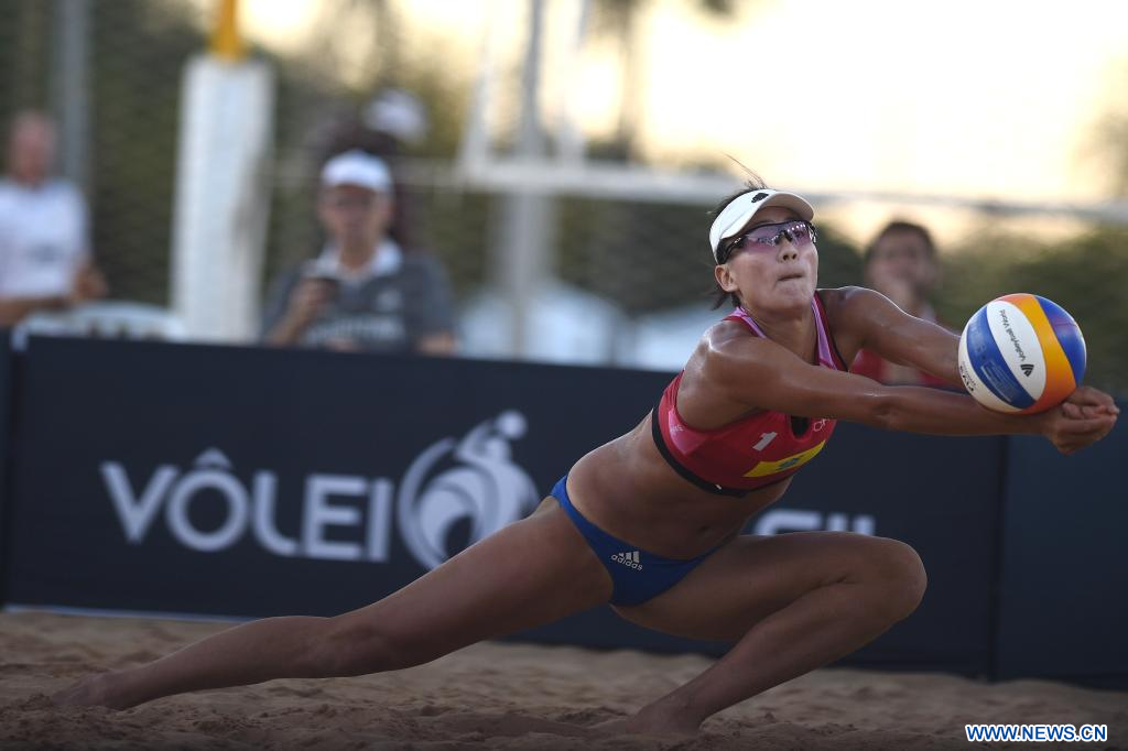 Chen Xue, de China, recibe el balón durante el partido de clasificación femenina entre Kristen Nuss y Taryn Kloth, de Estados Unidos, y Chen Xue y Xia Xinyi, de China, en el Elite 16 del Volleyball World Beach Pro Tour 2024, en Brasilia, Brasil, el 4 de mayo de 2024. (Xinhua/Lucio Tavora)