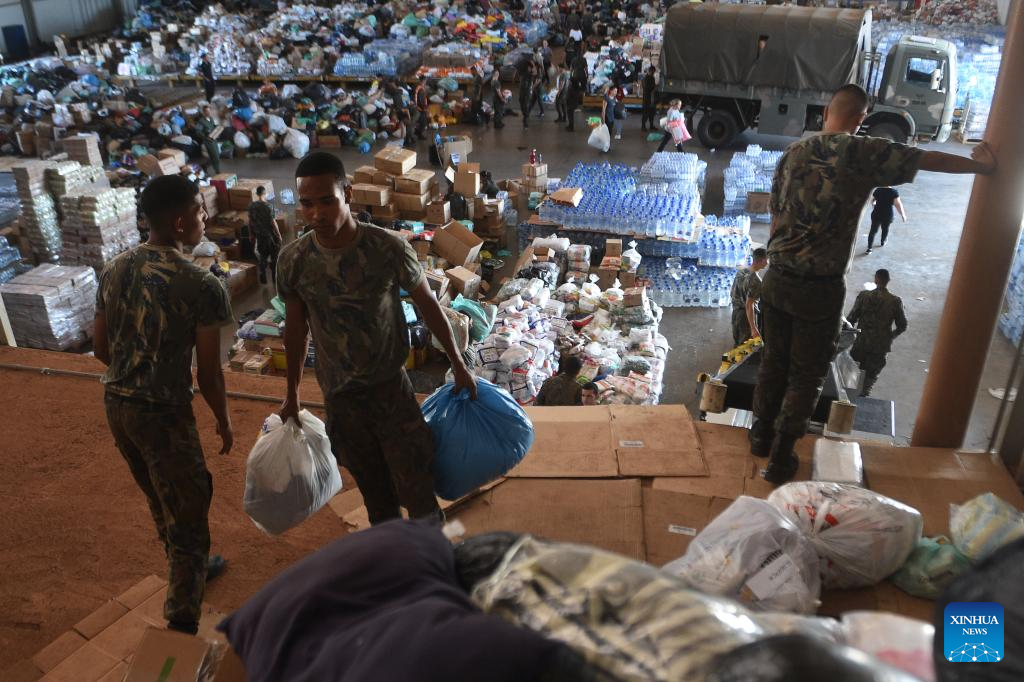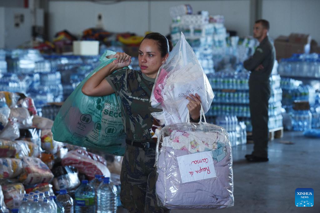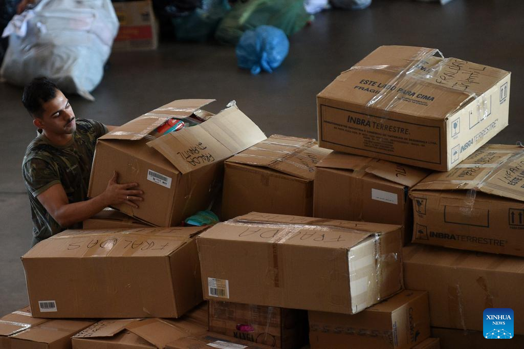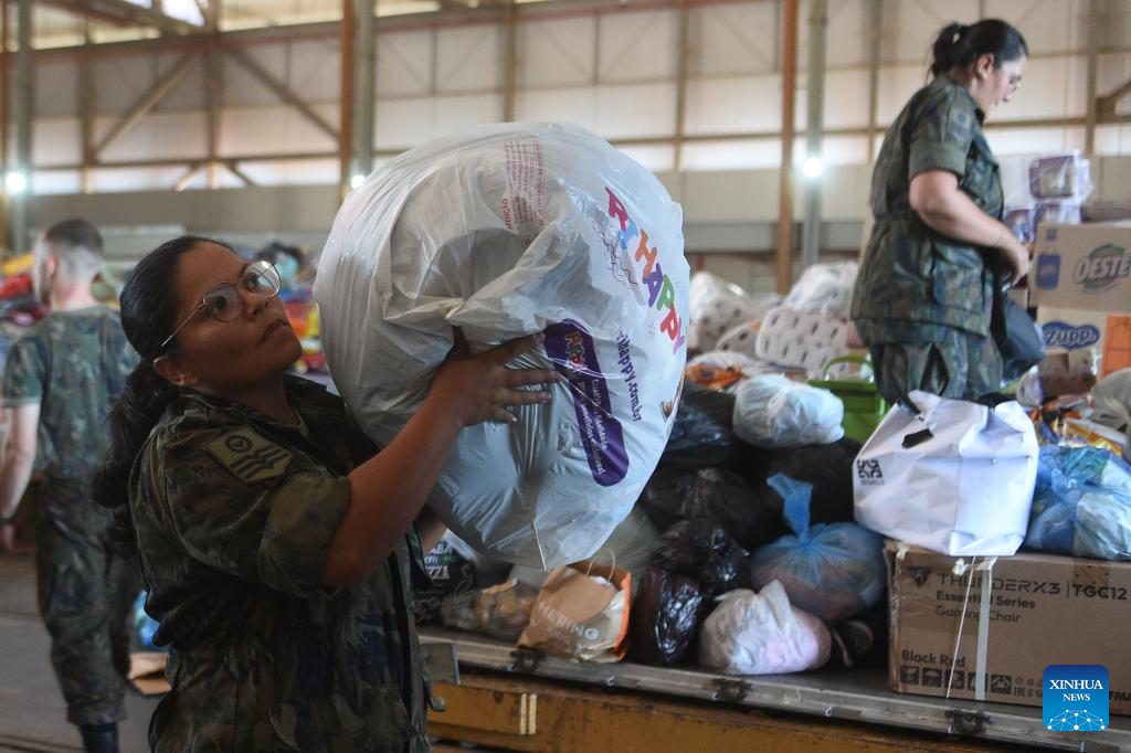 Un soldado de la Fuerza Aérea brasileña transporta donaciones recibidas para ser entregadas a las víctimas de las inundaciones de Rio Grande do Sul, en la Base Aérea de Brasilia, en Brasilia, Brasil, el 8 de mayo de 2024. Al menos 100 personas perdieron la vida y casi 100.000 viviendas han resultado destruidas o con daños importantes a causa de las intensas lluvias e inundaciones registradas desde hace más de una semana en el estado de Rio Grande do Sul, en la región sur de Brasil, según el balance dado a conocer el miércoles por las autoridades locales. (Xinhua/Lucio Tavora)