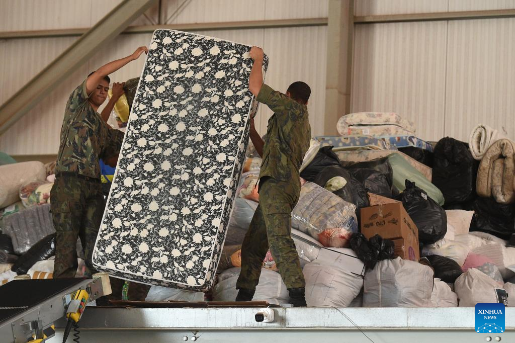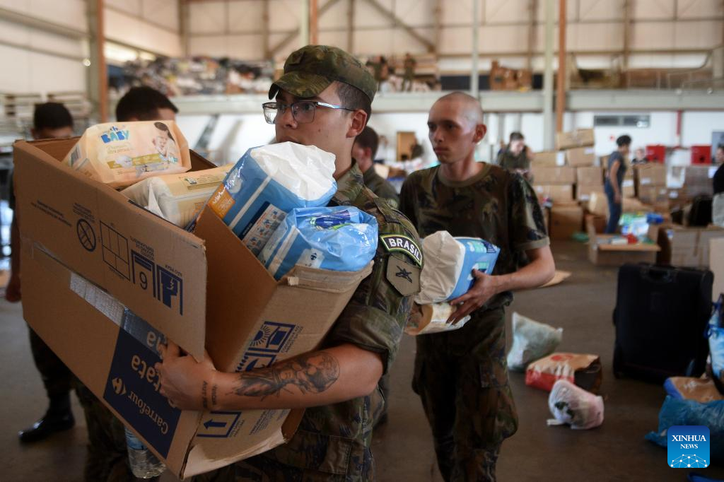 Soldados de la Fuerza Aérea brasileña acomodan donaciones recibidas para ser entregadas a las víctimas de las inundaciones de Rio Grande do Sul, en la Base Aérea de Brasilia, en Brasilia, Brasil, el 8 de mayo de 2024. Al menos 100 personas perdieron la vida y casi 100.000 viviendas han resultado destruidas o con daños importantes a causa de las intensas lluvias e inundaciones registradas desde hace más de una semana en el estado de Rio Grande do Sul, en la región sur de Brasil, según el balance dado a conocer el miércoles por las autoridades locales. (Xinhua/Lucio Tavora)