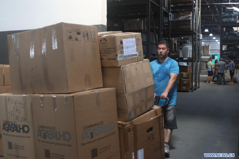 Un voluntario trabaja en la sede del fondo social del Gobierno del Estado de Sao Paulo recibiendo, seleccionando y entregando donaciones a las víctimas del estado de Rio Grande do Sul, en Sao Paulo, Brasil, el 9 de mayo de 2024. Se elevaron a 107 las víctimas fatales a causa de las intensas lluvias y las inundaciones registradas en el estado de Rio Grande do Sul, en la región sur de Brasil, desde finales de abril pasado, luego de que las autoridades locales confirmaron otros siete decesos en las últimas horas, informó el jueves la Defensa Civil. (Xinhua/Rahel Patrasso)