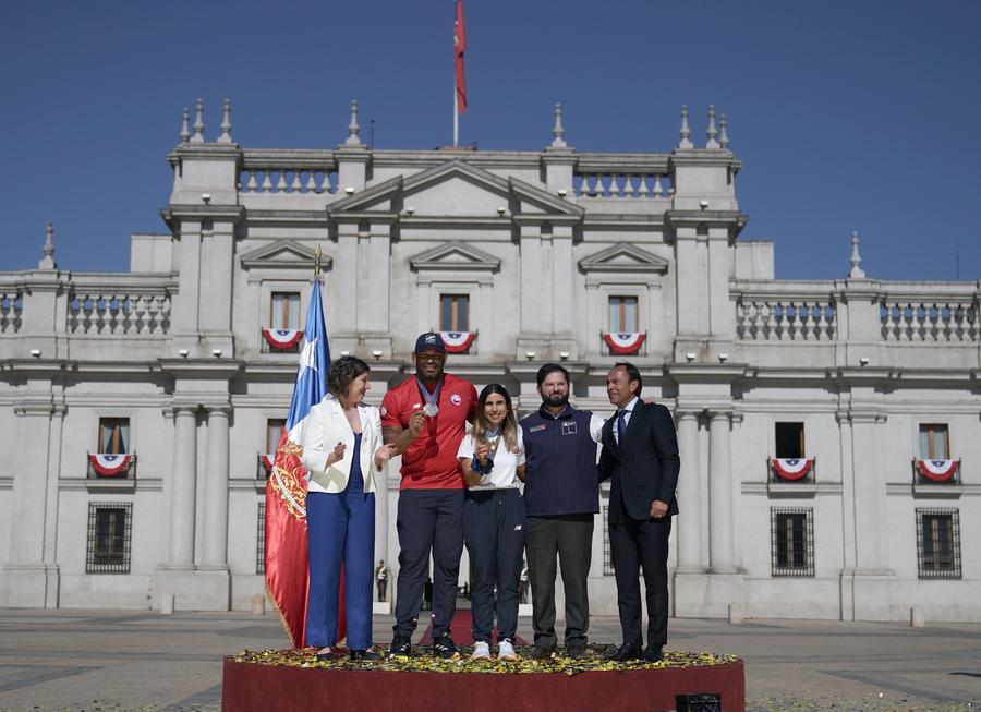 Los atletas ingresaron al Palacio de La Moneda, la casa presidencial chilena ubicada en el casco histórico de la capital, sosteniendo una bandera del país, junto al ministro del Deporte chileno, Jaime Pizarro, y la subsecretaria del Deporte, Antonia Illanes.