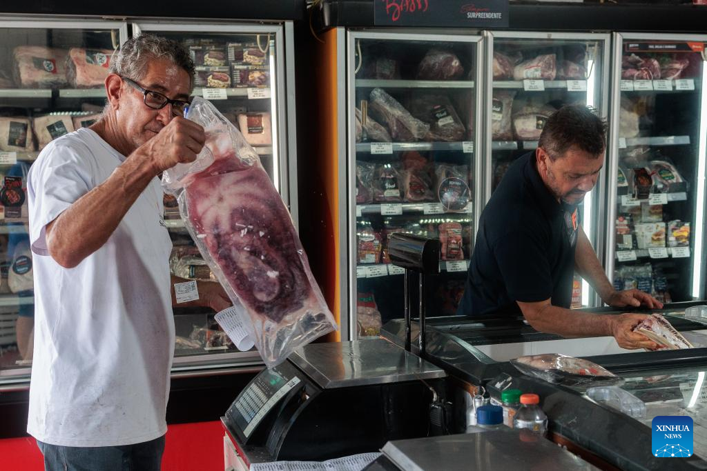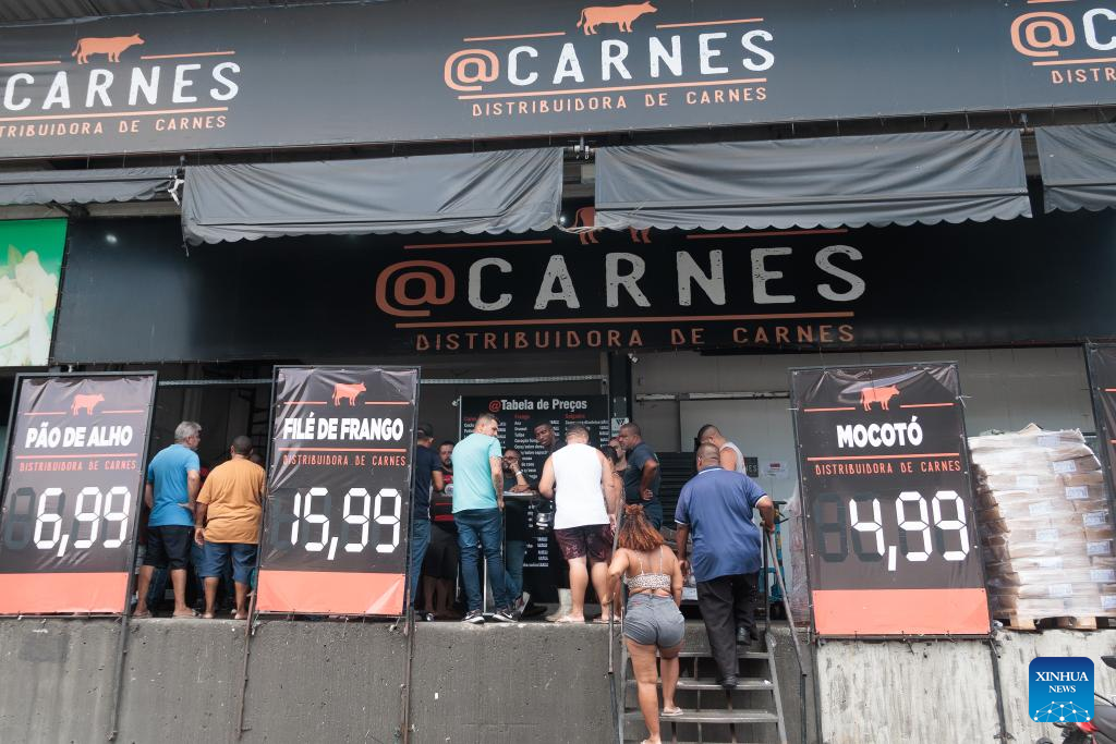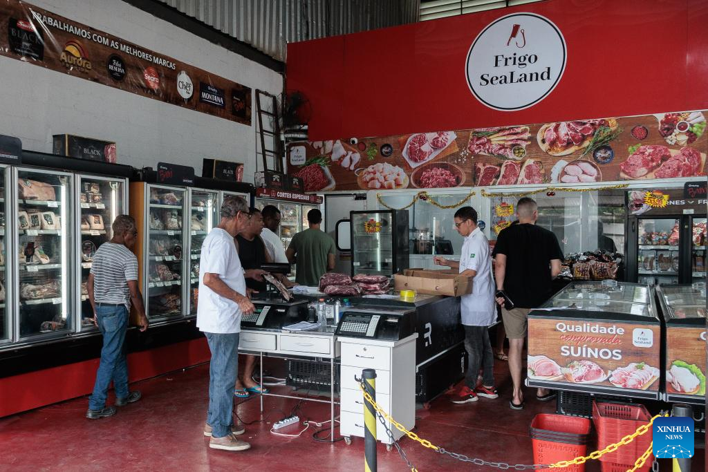 Imagen del 20 de diciembre de 2024 de personas comprando carne en una distribuidora de carnes en la Central de Abastecimiento de Alimentos (Ceasa), en Río de Janeiro, Brasil. La Ceasa de Río de Janeiro, Brasil, la segunda mayor de América Latina, está preparándose para una nueva campaña navideña, en la que las ventas de alimentos aumentan considerablemente en comparación con otros períodos del año. (Xinhua/Claudia Martini)