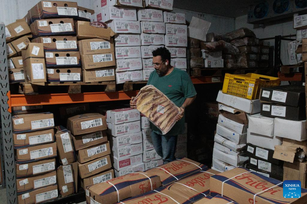 Imagen del 20 de diciembre de 2024 de un vendedor sosteniendo costillas de ternera en el almacén frigorífico de la tienda Frigo SeaLand en la Central de Abastecimiento de Alimentos (Ceasa), en Río de Janeiro, Brasil. La Ceasa de Río de Janeiro, Brasil, la segunda mayor de América Latina, está preparándose para una nueva campaña navideña, en la que las ventas de alimentos aumentan considerablemente en comparación con otros períodos del año. (Xinhua/Claudia Martini)