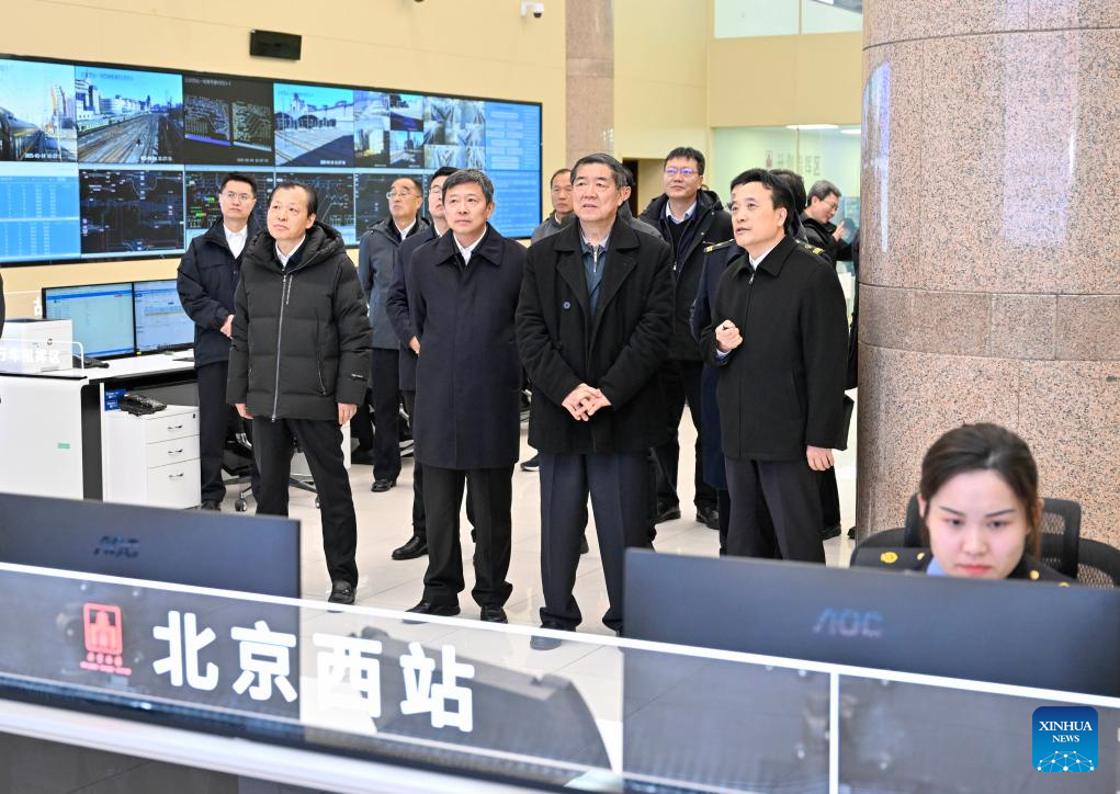 El vice primer ministro chino, He Lifeng, también miembro del Buró Político del Comité Central del Partido Comunista de China, inspecciona la Estación del Ferrocarril del Oeste de Beijing, en Beijing, capital de China, el 14 de enero de 2025. He instó el martes a todas las regiones, departamentos y empresas pertinentes a garantizar la seguridad y la comodidad de los viajes con motivo de la Fiesta de la Primavera, así como la operación sin contratiempos del transporte y la logística, durante una inspección de los centros de transporte de Beijing, incluidos el Aeropuerto Internacional Daxing y la Estación del Ferrocarril del Oeste de Beijing. (Xinhua/Yin Bogu)