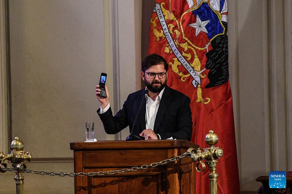 Imagen del 13 de enero de 2025 del presidente chileno, Gabriel Boric, pronunciando un discurso durante la ceremonia de inauguración de la decimocuarta edición del Congreso Futuro de Chile, en el Salón de Honor del Congreso Nacional de Santiago, en Santiago, capital de Chile. La decimocuarta edición del Congreso Futuro de Chile, el espacio de encuentro de las ideas y el pensamiento más importante de América Latina, arrancó el lunes con el saludo de astronautas chinos y un llamado a la cooperación internacional. (Xinhua/Jorge Villegas)