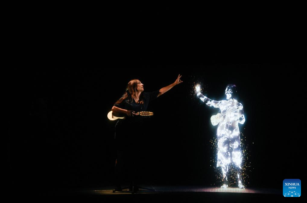 Imagen del 13 de enero de 2025 de la artista chilena, Javiera Parra (i), presentando "Una Canción en Dos Tiempos", un homenaje a Violeta Parra, durante la ceremonia de inauguración de la decimocuarta edición del Congreso Futuro de Chile, en el Centro Cultural CEINA, en Santiago, capital de Chile. La decimocuarta edición del Congreso Futuro de Chile, el espacio de encuentro de las ideas y el pensamiento más importante de América Latina, arrancó el lunes con el saludo de astronautas chinos y un llamado a la cooperación internacional. (Xinhua/Jorge Villegas)