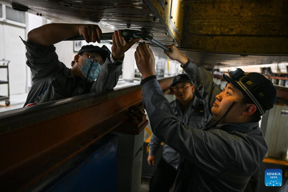 - HOHHOT, 18 enero, 2025 (Xinhua) -- Imagen del 17 de enero de 2025 de técnicos realizando el mantenimiento a la parte inferior de un tren bala en un depósito de trenes, en Hohhot, en la región autónoma de Mongolia Interior, en el norte de China. El mantenimiento de los trenes bala está en pleno apogeo en un depósito de trenes en Hohhot para garantizar la seguridad de los viajes durante la temporada alta de viajes por el Festival de Primavera de este año. (Xinhua/Lian Zhen)
