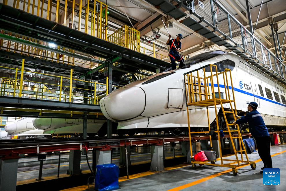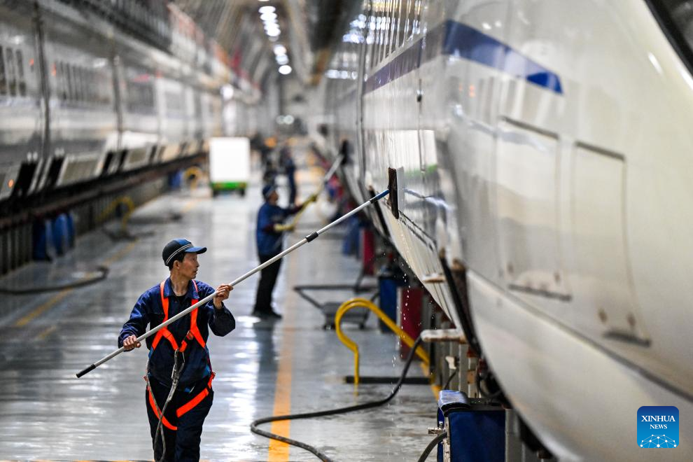 HOHHOT, 18 enero, 2025 (Xinhua) -- Imagen del 17 de enero de 2025 de trabajadores limpiando la superficie de un tren bala en un depósito de trenes, en Hohhot, en la región autónoma de Mongolia Interior, en el norte de China. El mantenimiento de los trenes bala está en pleno apogeo en un depósito de trenes en Hohhot para garantizar la seguridad de los viajes durante la temporada alta de viajes por el Festival de Primavera de este año. (Xinhua/Lian Zhen)
