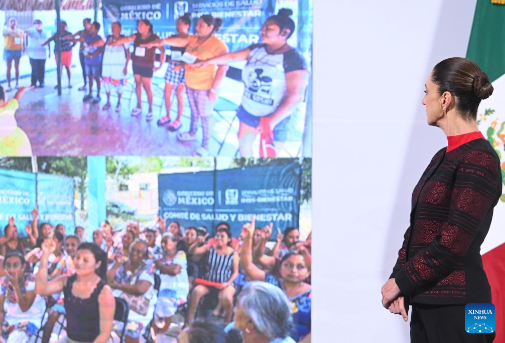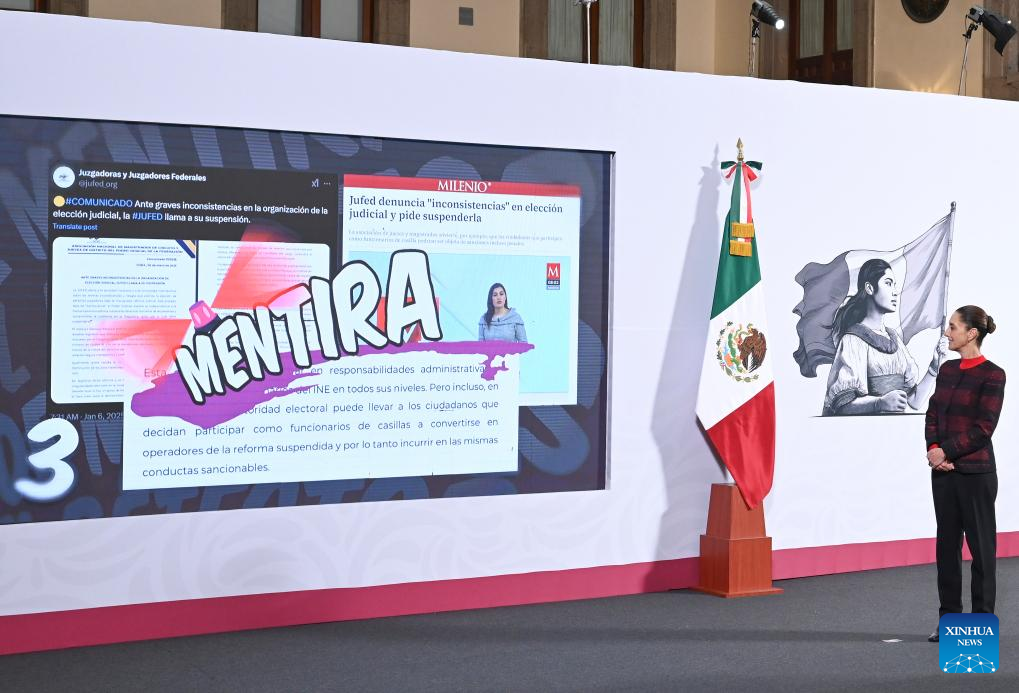 Imagen cedida por la Presidencia de México de la presidenta mexicana, Claudia Sheinbaum, observando durante su conferencia de prensa matutina, en Palacio Nacional, en la Ciudad de México, capital de México, el 22 de enero de 2025. Sheinbaum anunció el miércoles que el diálogo formal entre México y Estados Unidos inició de manera formal la víspera, tras la llamada del secretario de Estado estadounidense, Marco Rubio, al canciller mexicano, Juan Ramón de la Fuente, para abordar temas clave como migración y seguridad. (Xinhua/Presidencia de México)