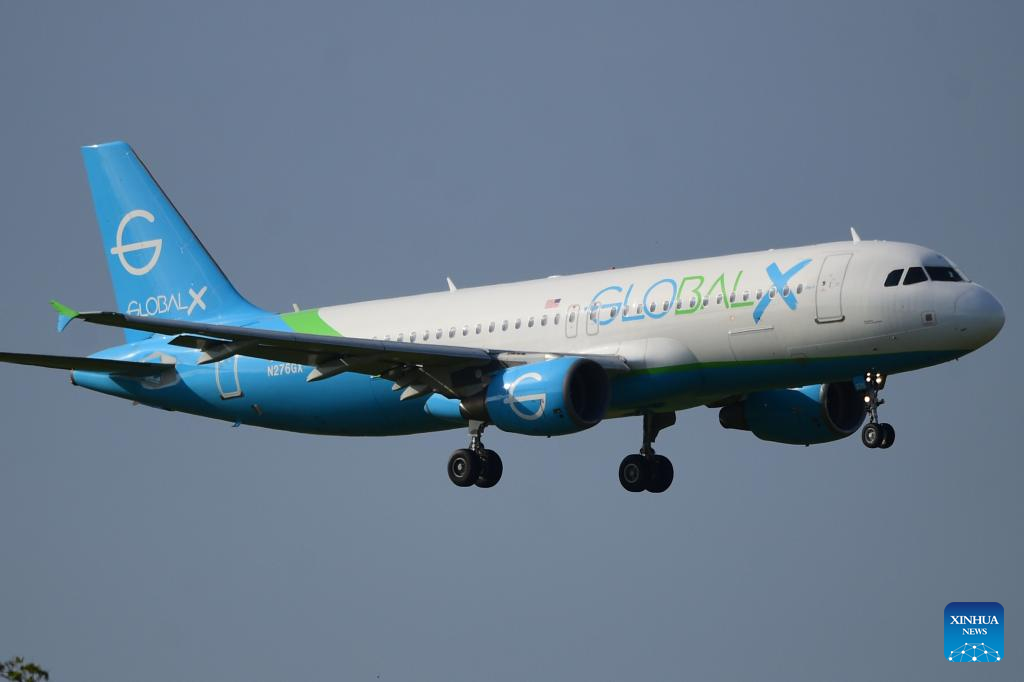 FORTALEZA, 7 febrero, 2025 (Xinhua) -- Un avión de la aerolínea GlobalX que trasporta brasileños deportados de Estados Unidos llega al aeropuerto de Fortaleza, en Fortaleza, estado de Ceará, Brasil, el 7 de febrero de 2025. El segundo vuelo con personas repatriadas de Estados Unidos desde el inicio de la nueva administración de Donald Trump aterrizó la tarde del viernes en el aeropuerto de Fortaleza, estado de Ceará, esta vez con 111 brasileños, entre hombres y mujeres adultos, adolescentes y niños. (Xinhua/Lucio Tavora)