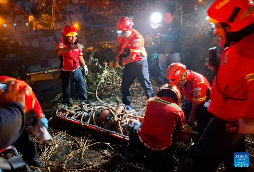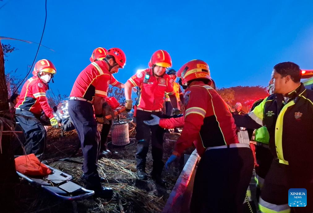 Rescatistas trasladan a una persona herida en el sitio de un accidente vial, en la Ciudad de Guatemala, Guatemala, el 10 de febrero de 2025. Decenas de personas fallecidas dejó un trágico accidente vial ocurrido la madrugada del lunes en la capital de Guatemala, cuando un autobús extraurbano cayó a un barranco a orillas de la Calzada La Paz, mientras que varios heridos que fueron trasladados al Hospital General San Juan de Dios, reportan medios locales. (Xinhua/Str)