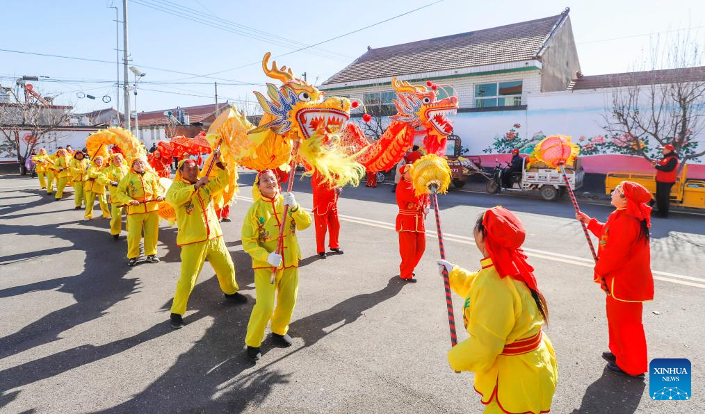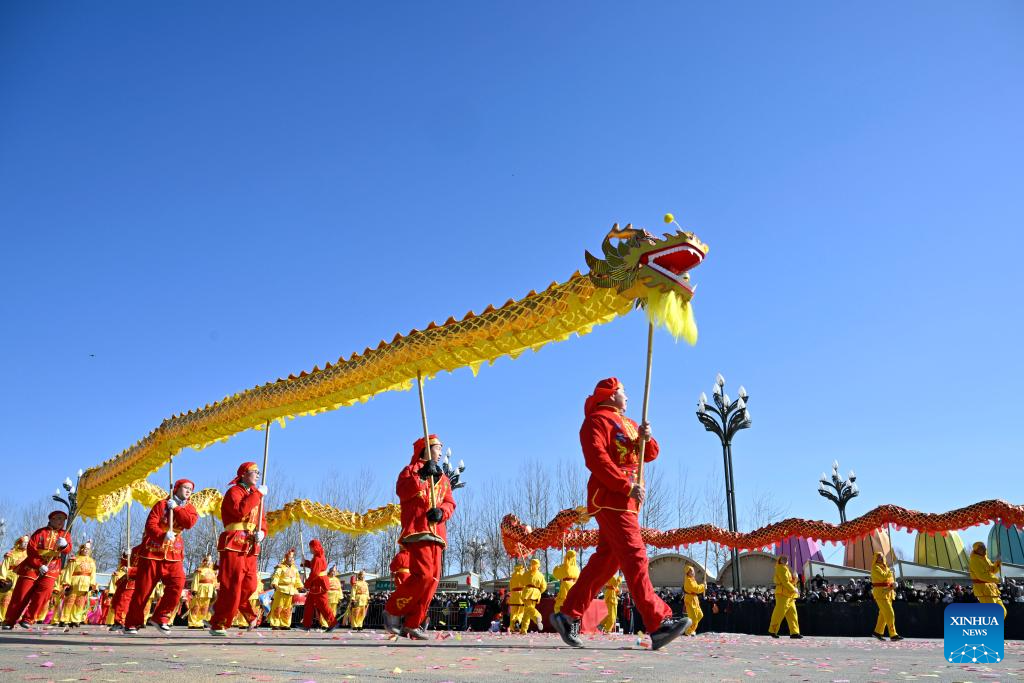 BEIJING, 12 febrero, 2025 (Xinhua) -- Artistas populares interpretan la danza del dragón, en Zunhua, en la provincia de Hebei, en el norte de China, el 12 de febrero de 2025. Diversas actividades se llevaron a cabo en toda China para celebrar el Festival de las Linternas, que cae el decimoquinto día del primer mes del calendario lunar chino. (Xinhua/Liu Mancang)