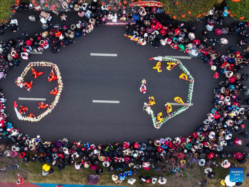 BEIJING, 12 febrero, 2025 (Xinhua) -- Vista aérea tomada con un dron el 12 de febrero de 2025 de personas observando una danza del dragón, en el distrito de Luxian, en la provincia de Sichuan, en el suroeste de China. Diversas actividades se llevaron a cabo en toda China para celebrar el Festival de las Linternas, que cae en el día quince del primer mes del calendario lunar chino. (Xinhua/He Haiyang)