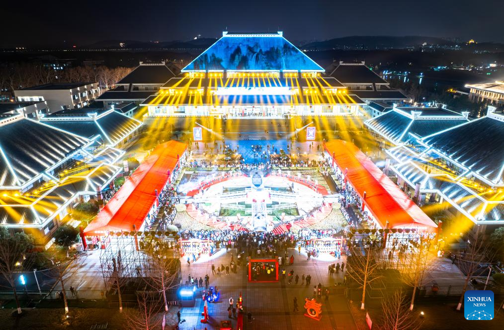 BEIJING, 12 febrero, 2025 (Xinhua) -- Vista aérea tomada con un dron el 12 de febrero de 2025 de artistas realizando una presentación en un punto escénico, en la ciudad de Luoyang, en la provincia de Henan, en el centro de China. Diversas actividades se llevaron a cabo en toda China para celebrar el Festival de las Linternas, que cae en el día quince del primer mes del calendario lunar chino. (Xinhua/Li Weichao)