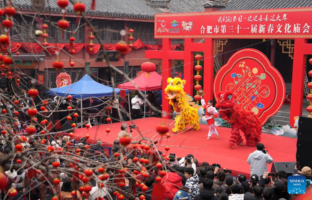 BEIJING, 12 febrero, 2025 (Xinhua) -- Personas observan la danza del león en una feria del templo, en Hefei, en la provincia de Anhui, en el este de China, el 12 de febrero de 2025. Diversas actividades se llevaron a cabo en toda China para celebrar el Festival de las Linternas, que cae el decimoquinto día del primer mes del calendario lunar chino. (Xinhua/Guo Chen)