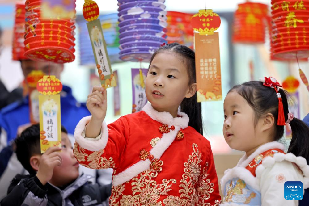 BEIJING, 12 febrero, 2025 (Xinhua) -- Niños participan en un juego de adivinanzas, en Zaozhuang, en la provincia de Shandong, en el este de China, el 12 de febrero de 2025. Diversas actividades se llevaron a cabo en toda China para celebrar el Festival de las Linternas, que cae el decimoquinto día del primer mes del calendario lunar chino. (Xinhua/Sun Zhongzhe)