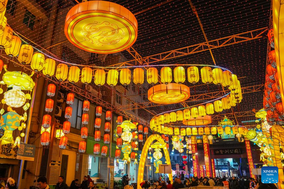 BEIJING, 12 febrero, 2025 (Xinhua) -- Personas disfrutan de linternas en el parque Bailuzhou, en Nanjing, en la provincia de Jiangsu, en el este de China, el 12 de febrero de 2025. Diversas actividades se llevaron a cabo en toda China para celebrar el Festival de las Linternas, que cae en el día quince del primer mes del calendario lunar chino. (Xinhua/Li Bo)
