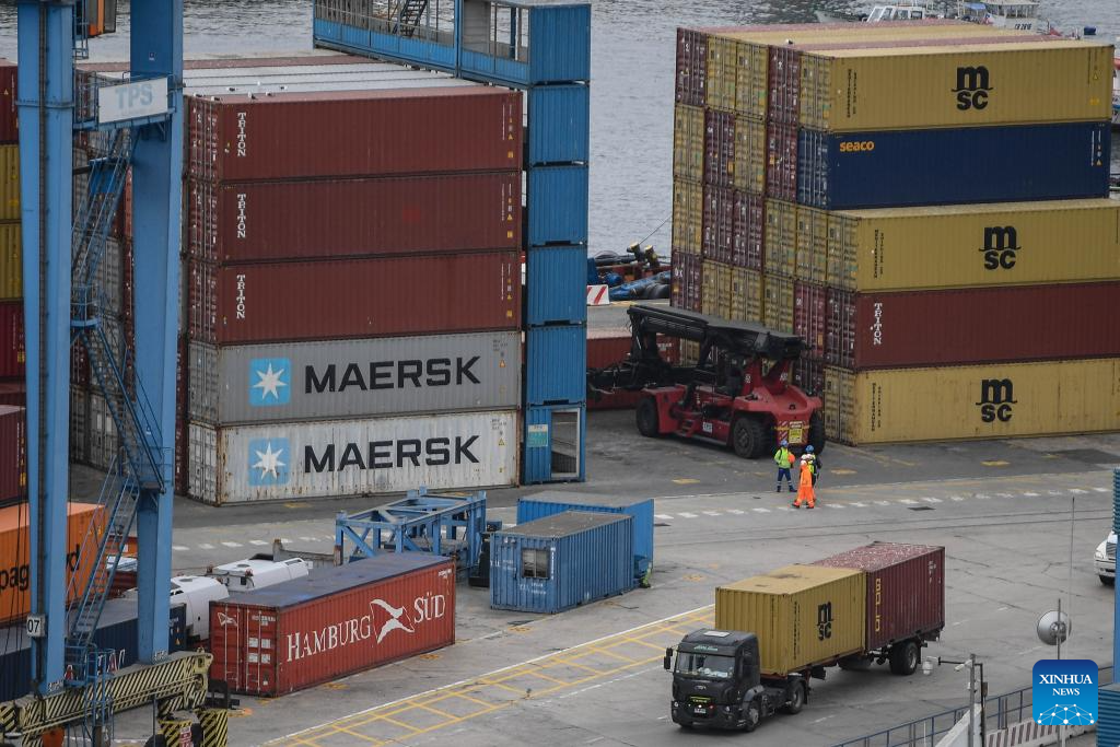 Imagen del 29 de enero de 2025 de contenedores apilados en el Puerto de Valparaíso, en la ciudad de Valparaíso, Chile. La exportación de cerezas chilenas a China durante esta temporada impulsó las ventas al extranjero de los productores de frutas del país austral, destacó el miércoles la Subsecretaría de Relaciones Económicas Internacionales de Chile. (Xinhua/Jorge Villegas)