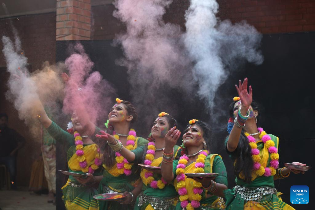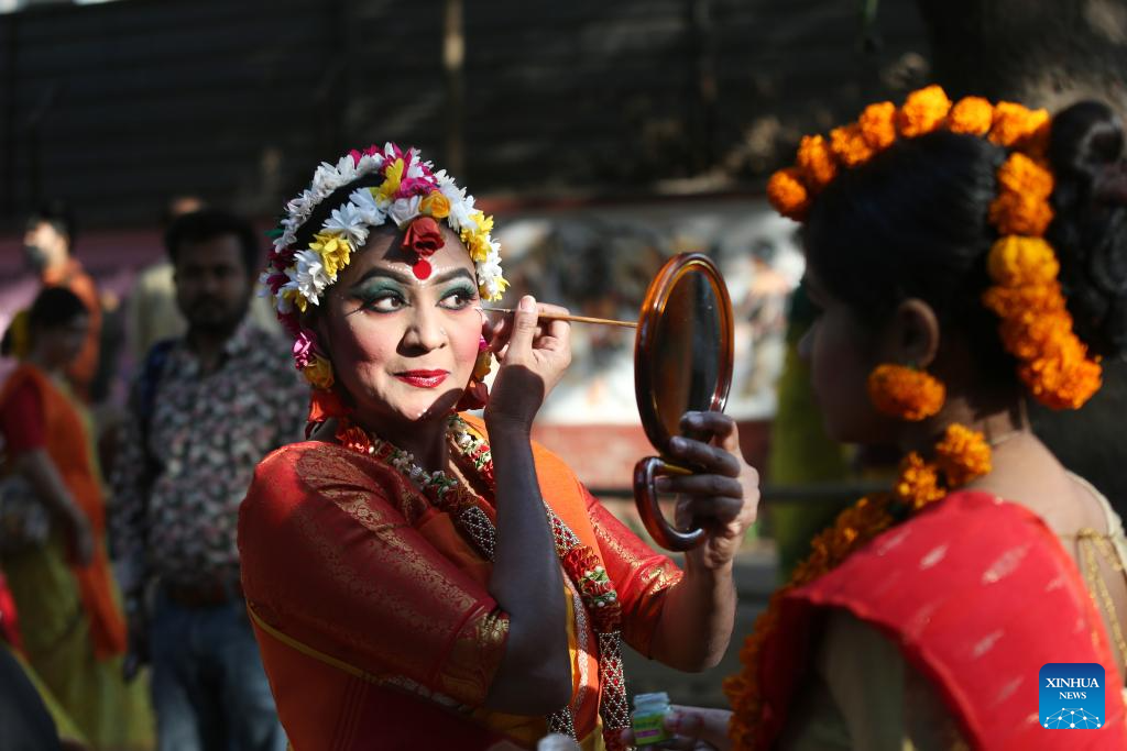DHAKA, 15 febrero, 2025 (Xinhua) -- Imagen del 14 de febrero de 2025 de personas asistiendo a la celebración del Pohela Falgun, en Dhaka, Bangladesh. Los bangladesíes celebraron el viernes el Pohela Falgun, que anuncia la llegada de la primavera. (Xinhua/Habibur Rahman)