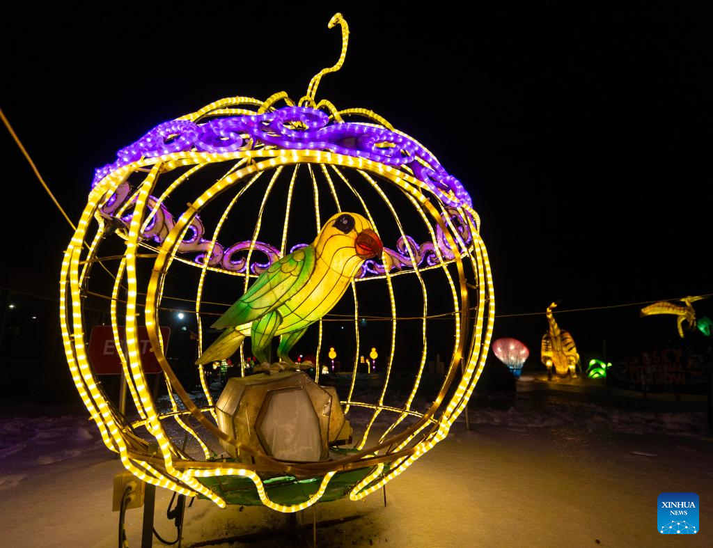 NIAGARA-ON-THE-LAKE, 15 febrero, 2025 (Xinhua) -- Imagen del 14 de febrero de 2025 de una instalación luminosa con forma de loro vista durante un espectáculo internacional de luces titulado "Noches Brillantes", en Niagara-on-the-Lake, en Ontario, Canadá. El espectáculo de luces al aire libre se lleva a cabo aquí del 6 de diciembre de 2024 al 1 de marzo de 2025. (Xinhua/Zou Zheng)