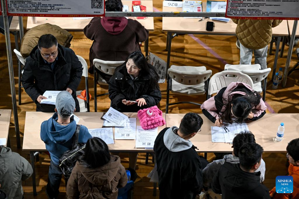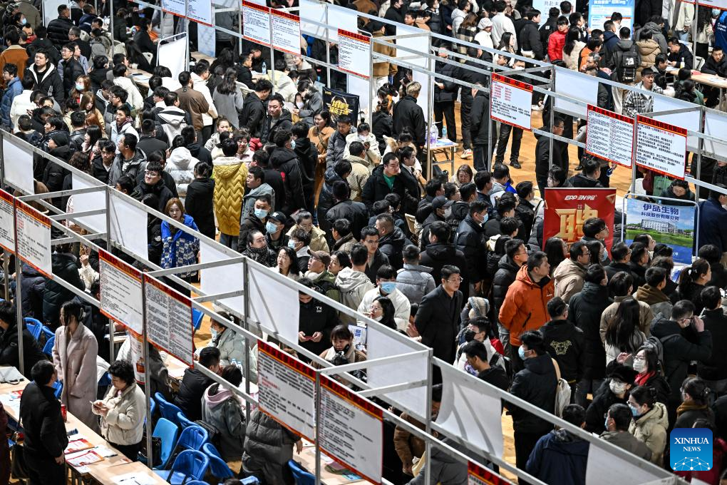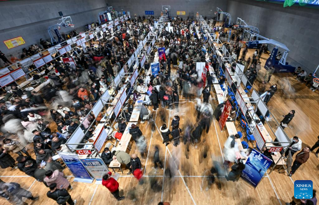 YINCHUAN, 15 febrero, 2025 (Xinhua) -- Solicitantes de trabajo asisten a una feria de empleo celebrada en Yinchuan, en la región autónoma hui de Ningxia, en el noroeste de China, el 15 de febrero de 2025. La feria de empleo comenzó aquí el sábado. Más de 200 empresas de diversas industrias, como las nuevas energías, la biotecnología y el comercio electrónico, ofrecen más de 4.000 vacantes a los solicitantes de trabajo. (Xinhua/Feng Kaihua)