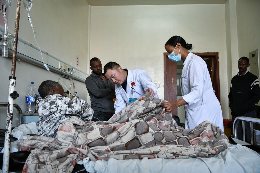 ADIS ABEBA, 17 febrero, 2025 (Xinhua) -- Imagen del 14 febrero de 2025 del doctor chino, Shang Chenguang, miembro del 25 equipo médico chino enviado a Etiopía, realizando una ronda de visitas en el Hospital General Tirunesh de Beijing, en Adis Abeba, Etiopía. El 25 equipo médico chino enviado a Etiopía llegó al país en mayo de 2024 y ha estado prestando servicios médicos a pacientes locales y formando a médicos locales. También se construyó el Hospital General de Beijing Tirunesh como parte de los esfuerzos de asistencia de larga data del Gobierno chino. (Xinhua/Han Xu)