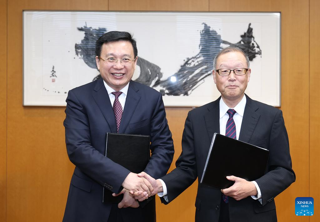 El presidente de la Agencia de Noticias Xinhua, Fu Hua, se reúne con Katsuhiko Sakai, presidente de Jiji Press de Japón, y firma un memorándum de entendimiento para impulsar la cooperación entre medios de comunicación, en Tokio, Japón, el 18 de febrero de 2025. (Xinhua/Jia Haocheng)