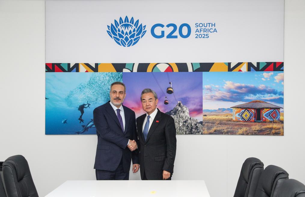 El ministro de Relaciones Exteriores chino, Wang Yi, también miembro del Buró Político del Comité Central del Partido Comunista de China, se reúne con el ministro de Relaciones Exteriores de Turquía, Hakan Fidan, al margen de la Reunión de Ministros de Relaciones Exteriores del G20, en Johannesburgo, Sudáfrica, el 20 de febrero de 2025. (Xinhua/Zhang Yudong)
