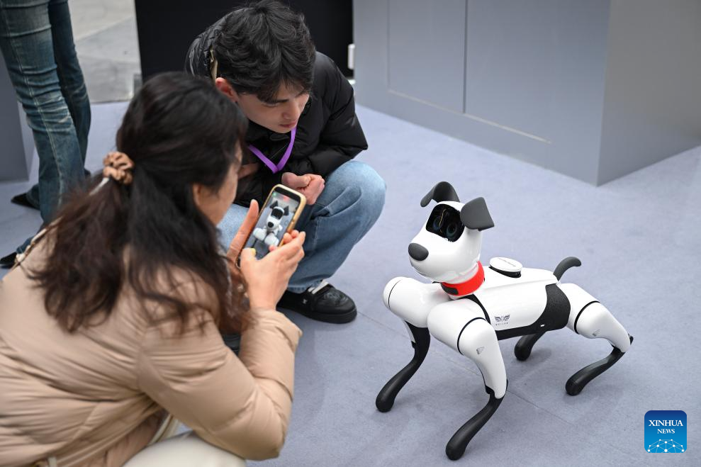 SHANGHAI, 21 febrero, 2025 (Xinhua) -- Personas interactúan con un perro robot en la Conferencia Mundial de Desarrolladores 2025 llevada a cabo en Shanghai, en el este de China, el 21 de febrero de 2025. La Conferencia Mundial de Desarrolladores 2025, que tendrá lugar del 21 al 23 de febrero en Shanghai, se centra en tecnologías de vanguardia, incluidos modelos de gran tamaño, potencia informática y plataformas de software. (Xinhua/Chen Haoming)