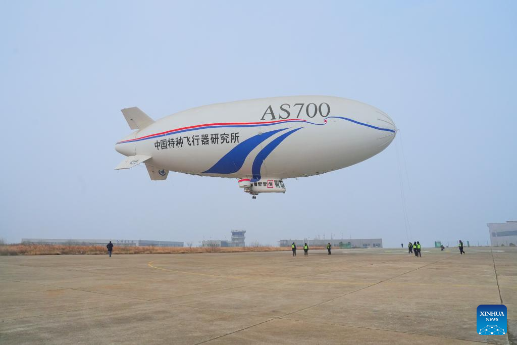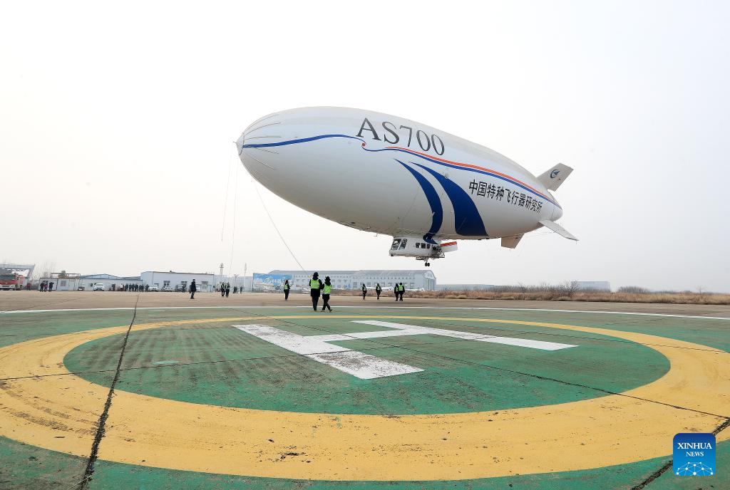 JINGMEN, 21 febrero, 2025 (Xinhua) -- El dirigible eléctrico tripulado AS700D de China es visto durante su vuelo inaugural, en Jingmen, en la provincia de Hubei, en el centro de China, el 21 de febrero de 2025. El dirigible eléctrico tripulado AS700D de China completó un exitoso vuelo inaugural el viernes, marcando un gran avance para el país en equipamiento de aviación verde en el sector de la economía de baja altitud, anunció la Corporación de la Industria de la Aviación de China (AVIC, por sus siglas en inglés), desarrolladora del dirigible. (Xinhua/AVIC)