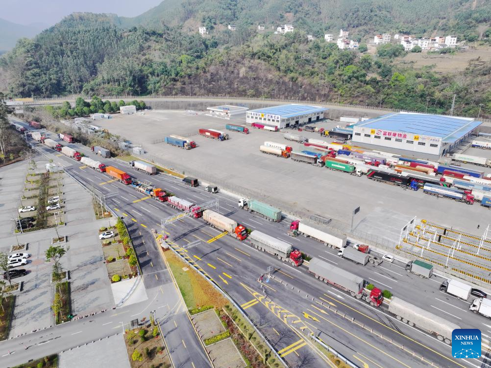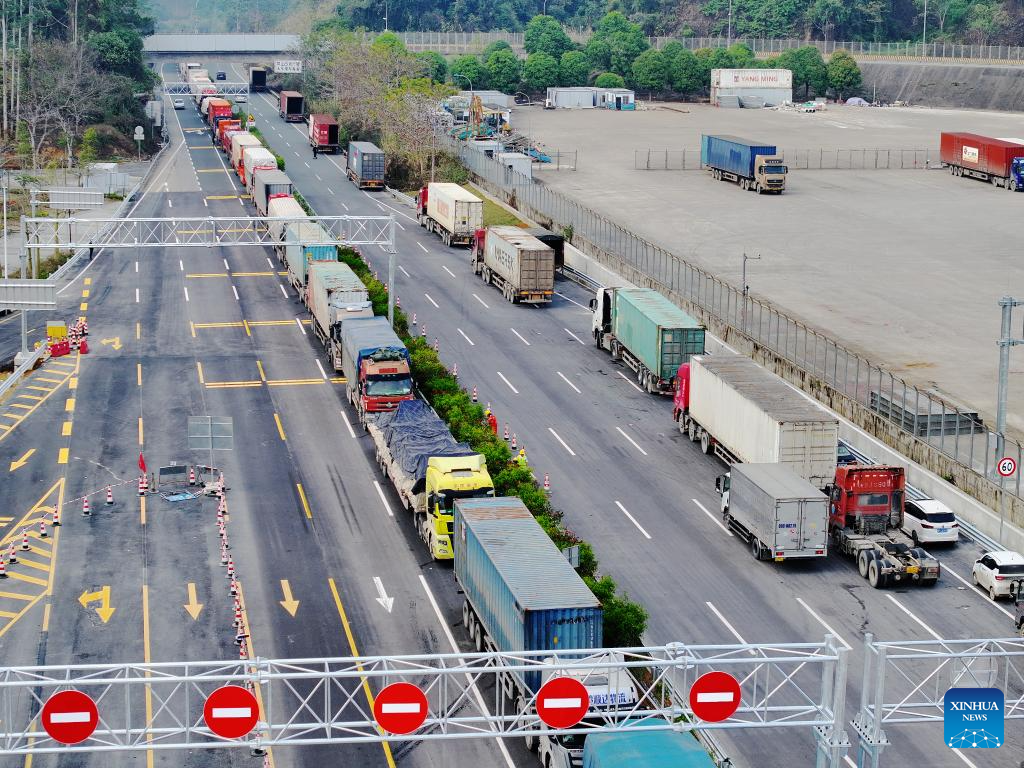 NANNING, 2 marzo, 2025 (Xinhua) -- Vista aérea tomada con un dron del 1 de marzo de 2025 de vehículos esperando a pasar a través del Puerto Youyiguan, o Paso de la Amistad, en la ciudad de Pingxiang, en la región autónoma zhuang de Guangxi, en el sur de China. Con el auge de la cooperación económica y comercial entre China y Vietnam, los principales puertos fronterizos son testigos de un aumento del tráfico fronterizo. (Xinhua/Zhou Hua)