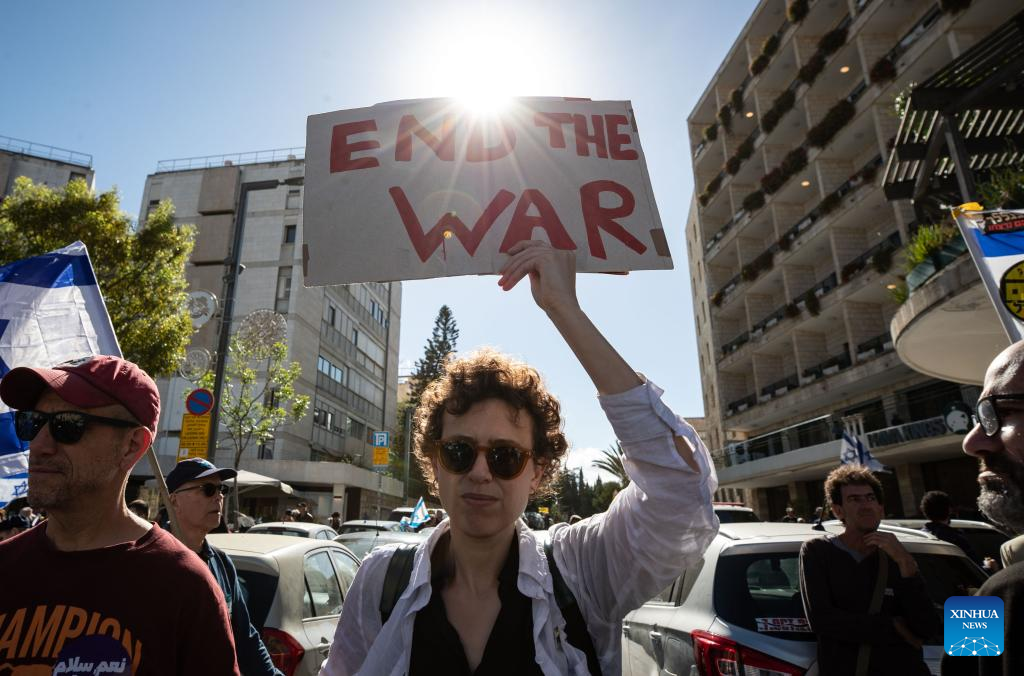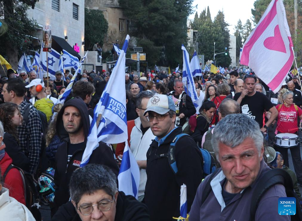 Imagen del 19 de marzo de 2025 de personas asistiendo a una manifestación cerca de la Oficina del Primer Ministro israelí, en Jerusalén. El miércoles se produjo una manifestación multitudinaria en Jerusalén para protestar contra la reanudación de las operaciones militares israelíes en Gaza, y exigir un cese al fuego inmediato y la liberación de los rehenes. Israel lanzó "una operación terrestre selectiva" en el centro y el sur de Gaza, con el objetivo de establecer una zona de amortiguación entre las partes norte y sur del enclave palestino, dijo el ejército en un comunicado el miércoles. El ejército indicó que la operación fue lanzada "en las últimas 24 horas", poco después de que Israel pusiera fin a un cese al fuego de dos meses y reanudara los ataques aéreos. (Xinhua/Chen Junqing)